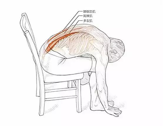 坐在椅子上,双脚开立,上半身慢慢俯身,双手自然下沉。直至竖脊肌有拉伸感,保持30秒。